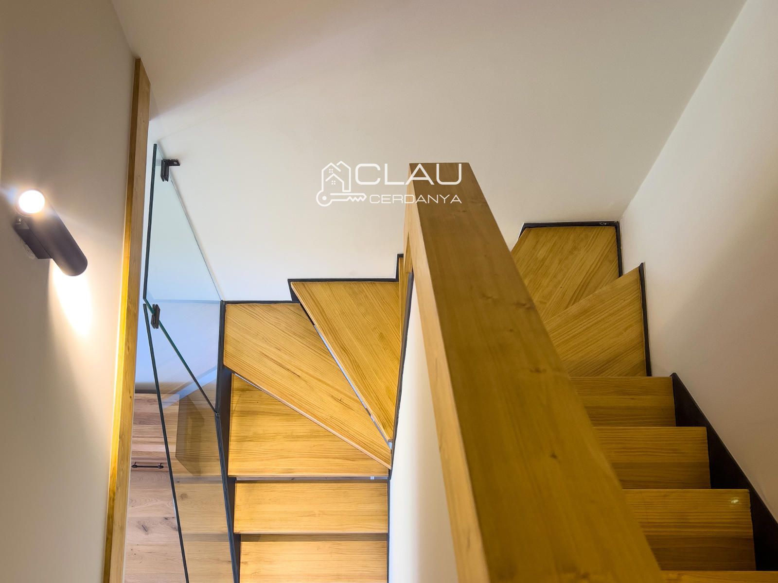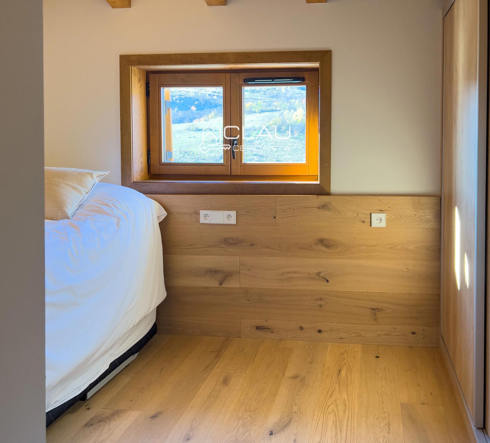En la planta superior, se distribuyen tres dormitorios (uno de ellos en suite) y dos baños. Los suelos de madera y la escalera con mampara de cristal aportan un toque contemporáneo y cálido, con abundante luz natural gracias a su orientación oeste y sus vistas abiertas a la montaña.